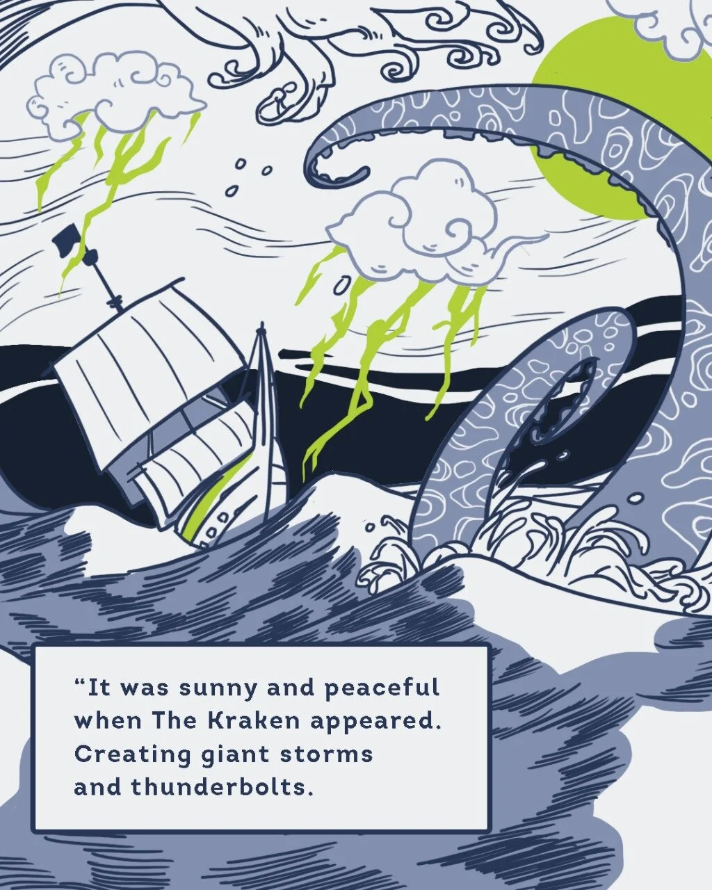 “It was sunny and peaceful when The Kraken appeared. Creating giant storms and thunderbolts. Terrified and hopeless, we saw those gigantic tentacles plunged thru our ship. Only to grab our ultimate coffee blend, then left us in awe.